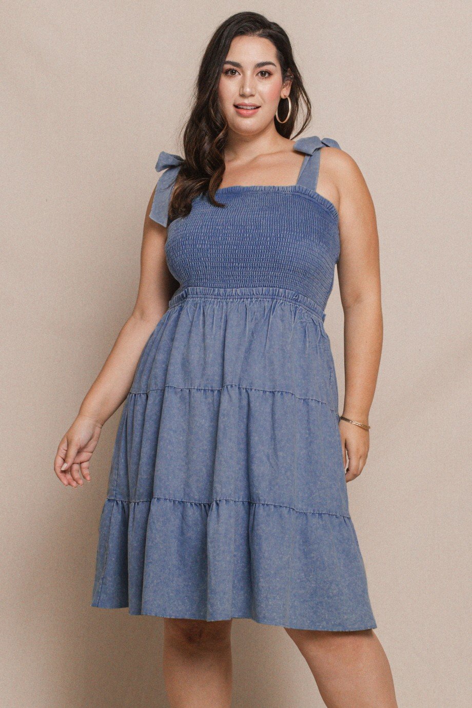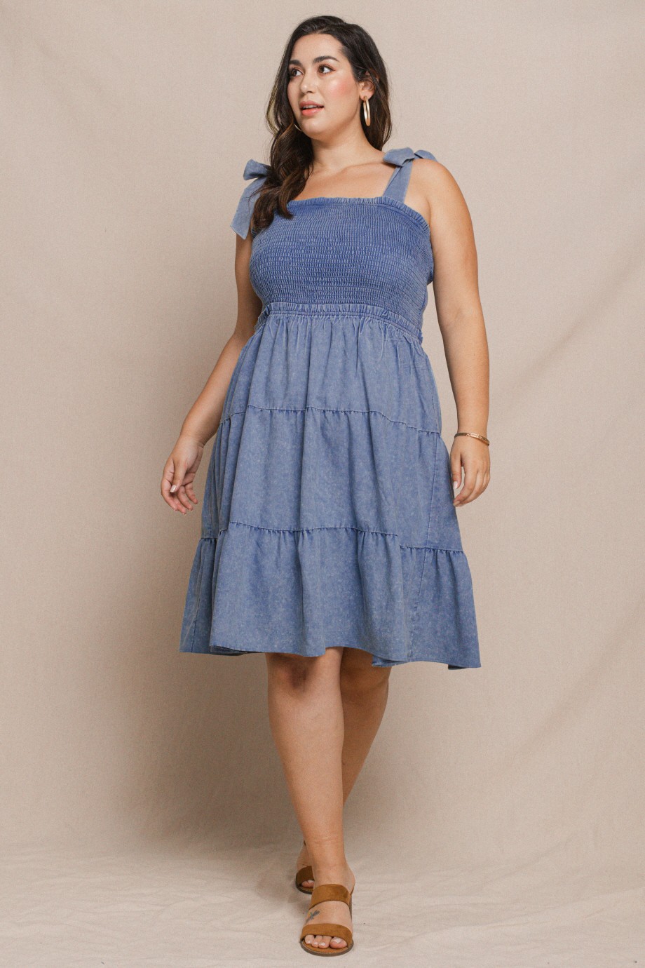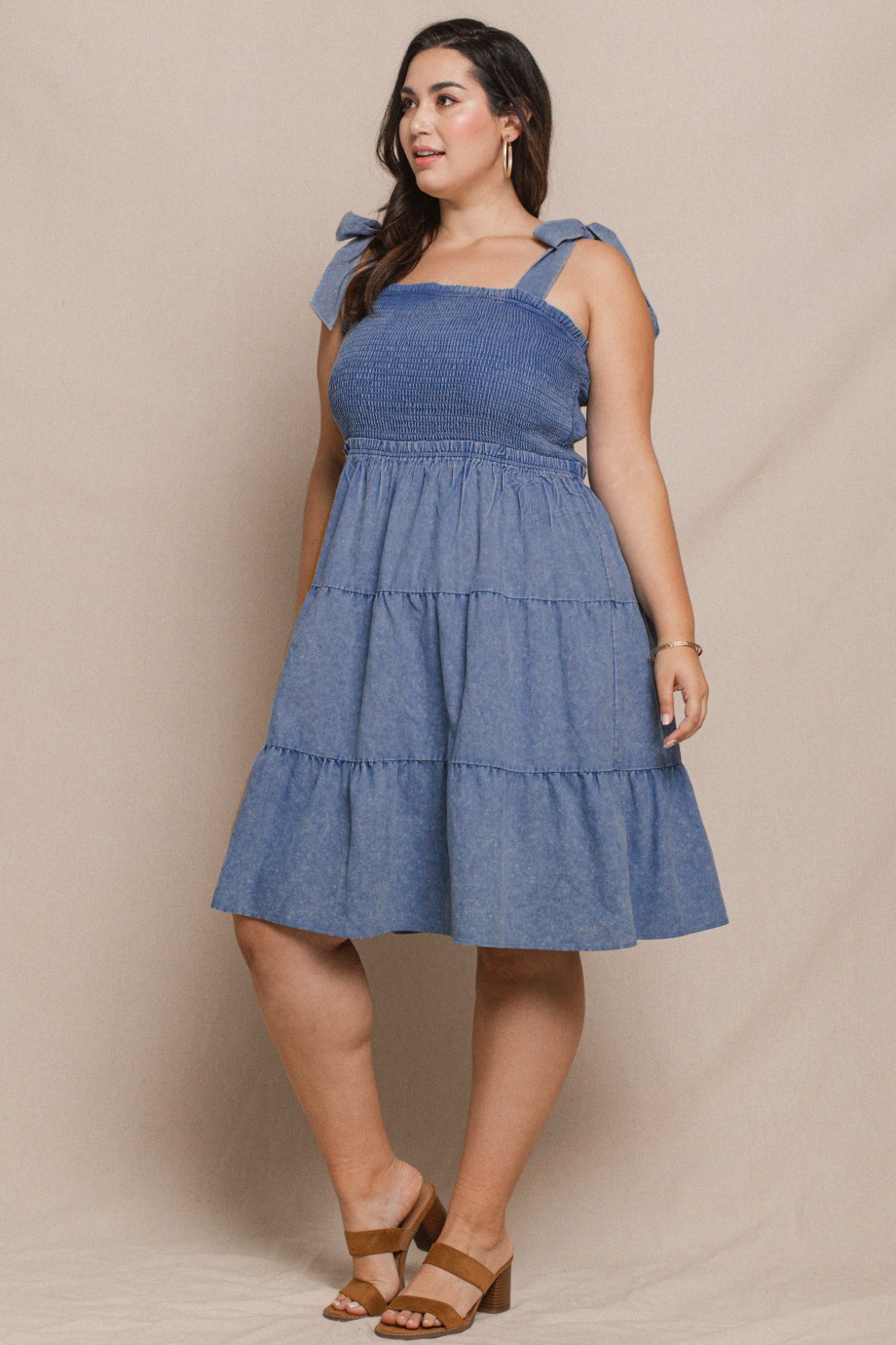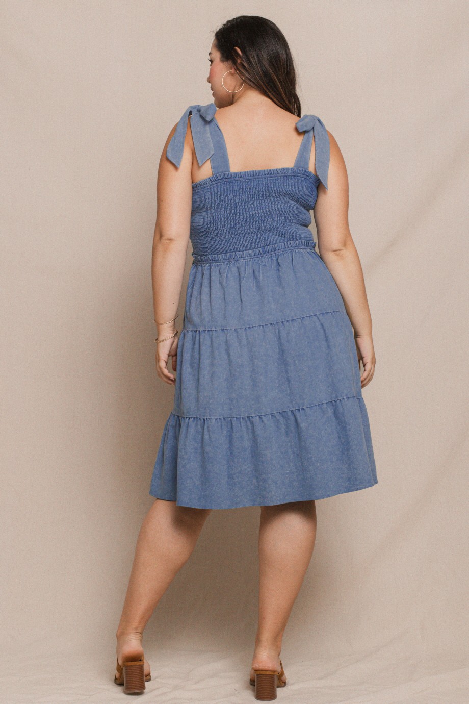 Soft, stretchy denim tiered midi dress with smocked top. Tied straps for the perfect fit. Flowy fit. All sales final.
