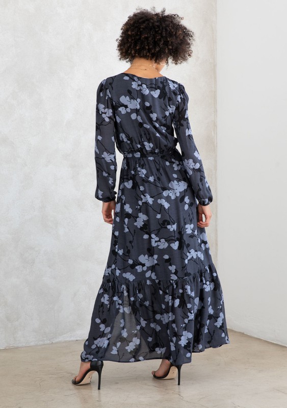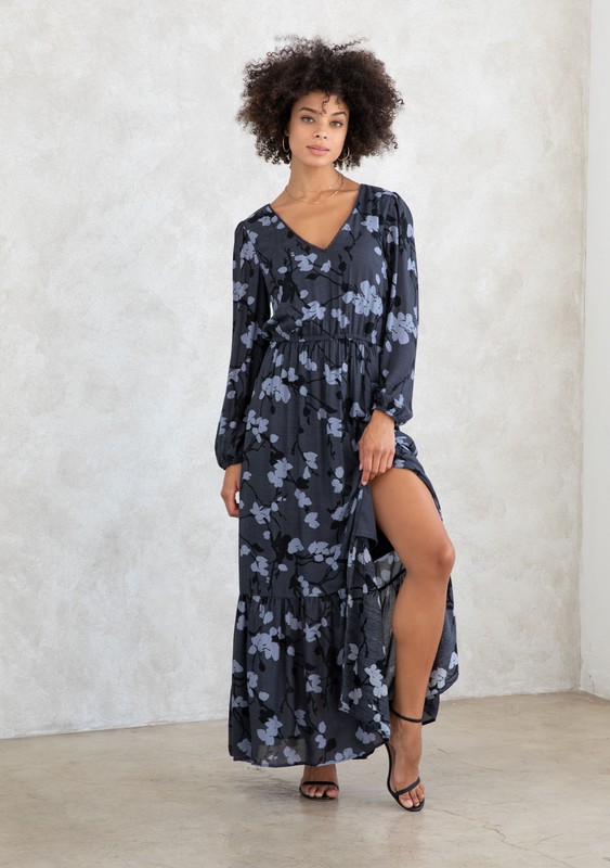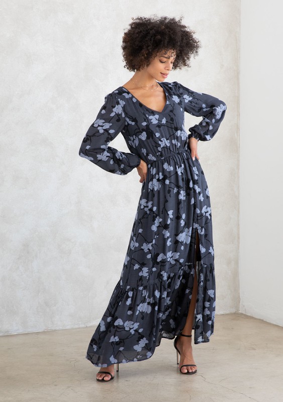 Floral V neck dress in dark grey with front slit detail. Long sleeves smocked waist. True to size. All sales final.