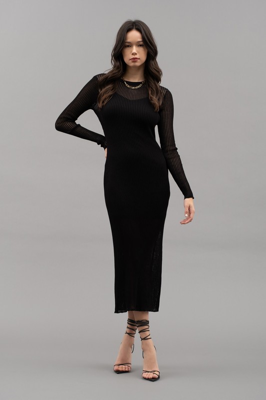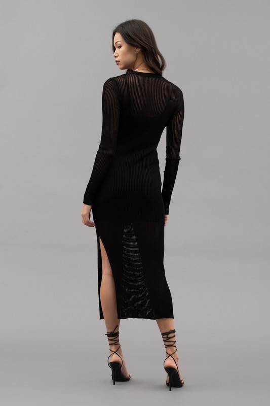 Beautiful sheer ribbed knit body con dress Nice stretch with a slip dress lining. Midi length and side slit. Fitted. All sales final.