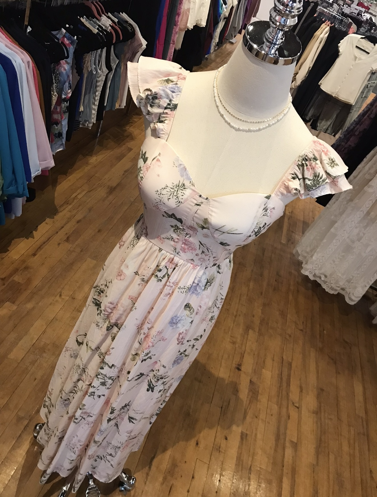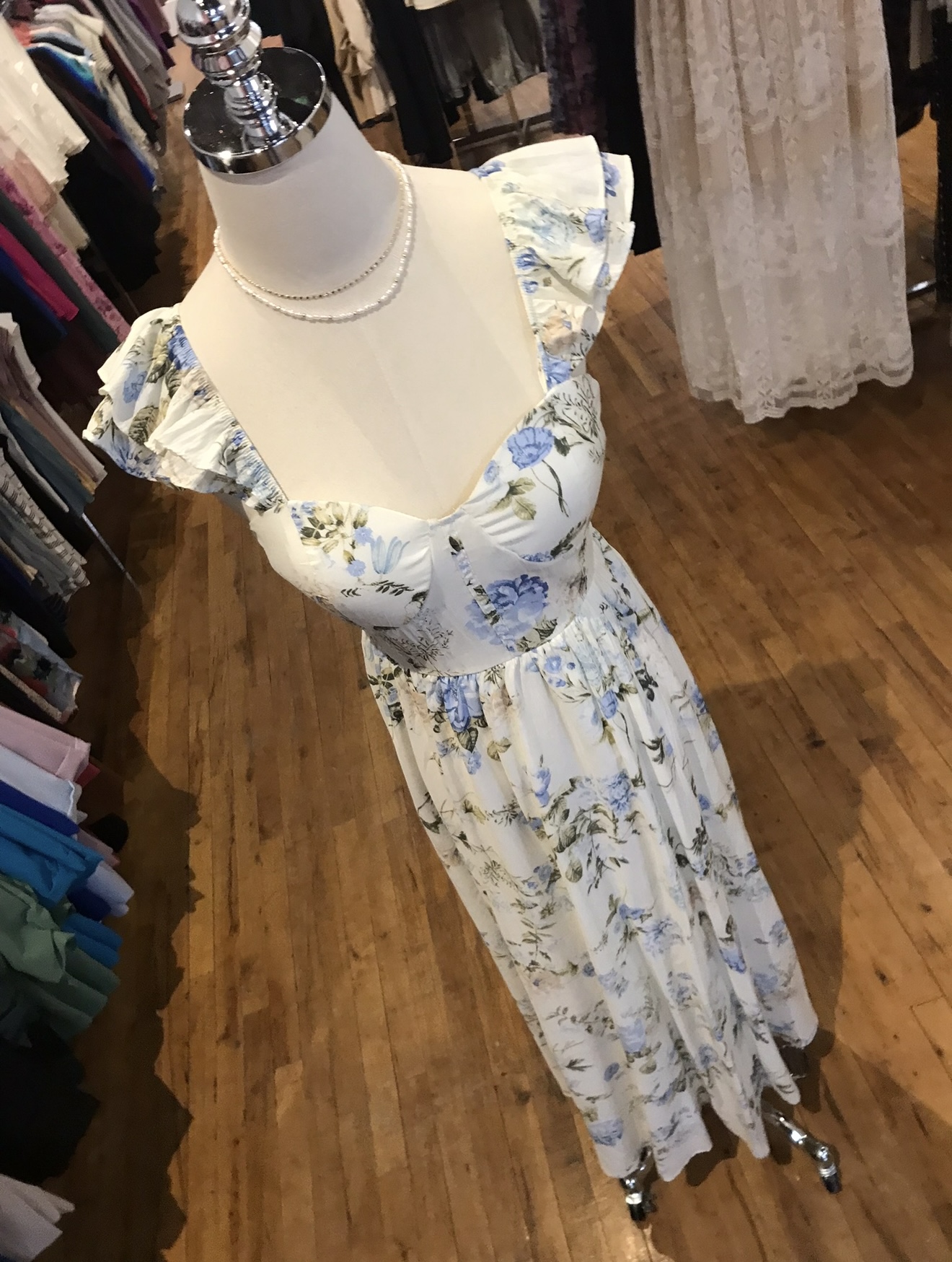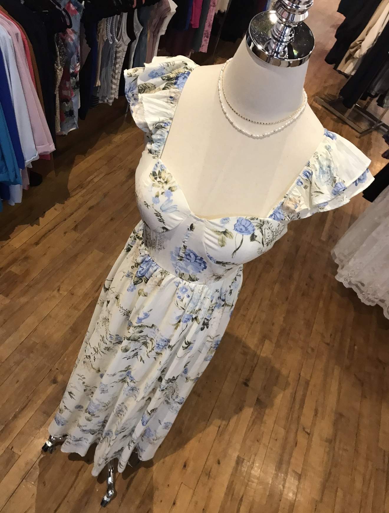 Beautiful floral corset dress with ruffle sleeves and smocked back. True to size. All sales final.