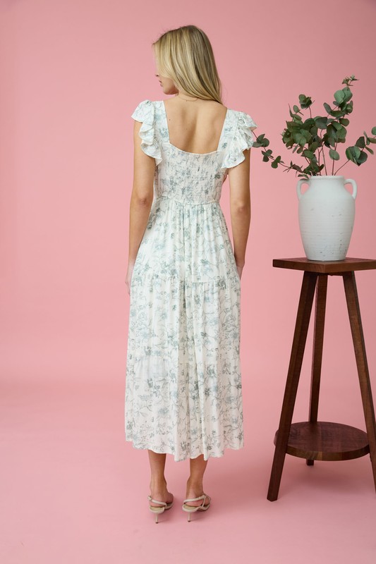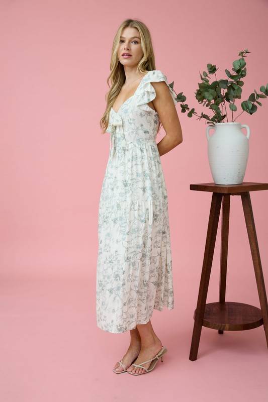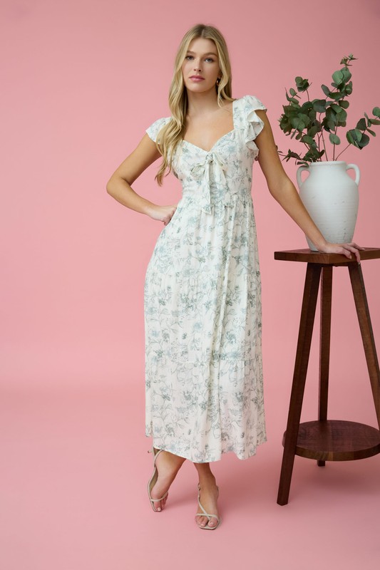 Bow detail floral dress with ruffle sleeves and smocked back. True to size. All sales final.