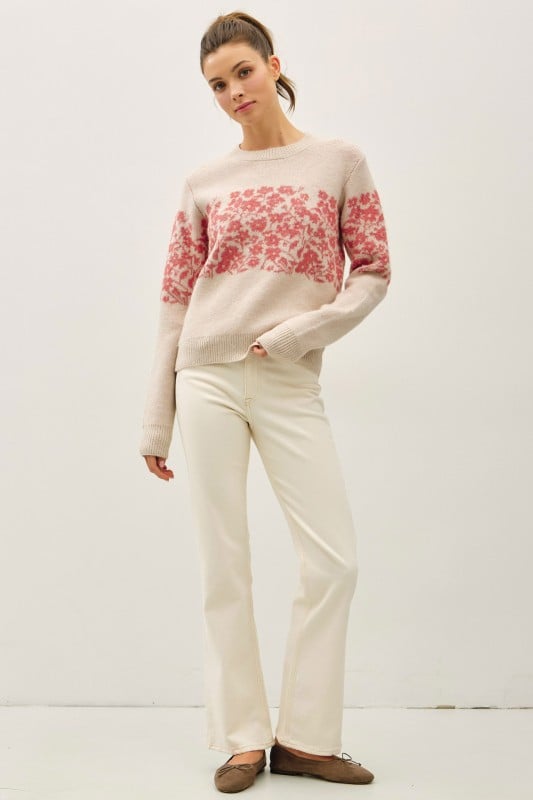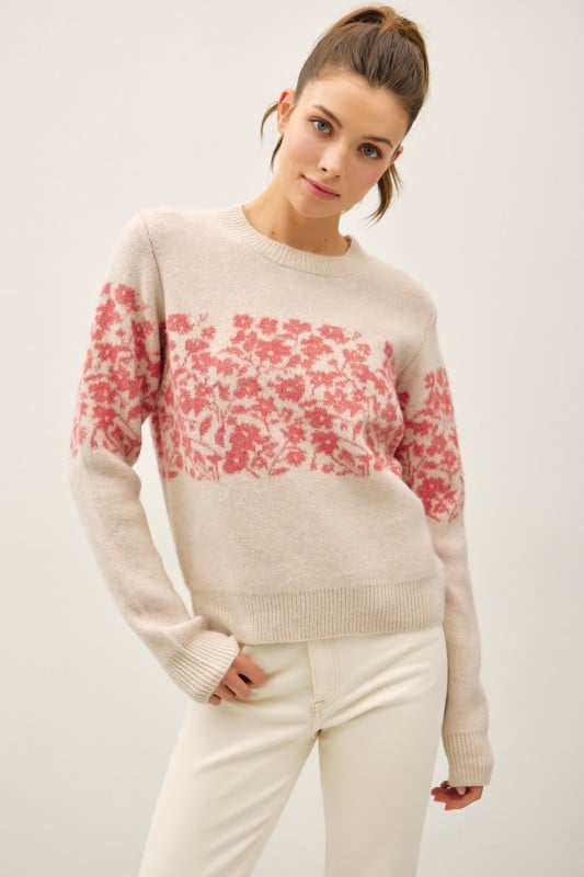 Ultra soft sweater with midline floral stripe. True to size. All Sales Final.