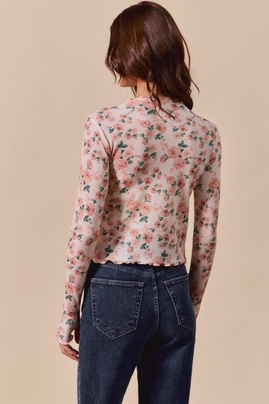 Beautiful floral print long sleeve with lettuce hem and thumb holes. Great piece to layer with denim. Slightly fitted. All sales final.