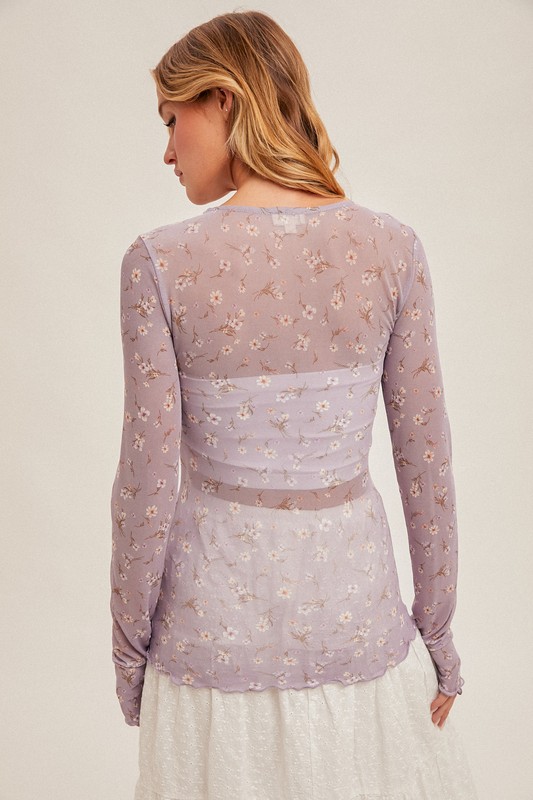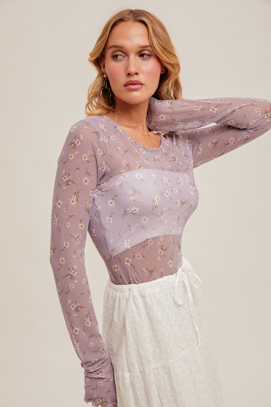 Ditsy floral print mesh long sleeve. Great piece to layer with high waist skirts or denim. Slightly fitted. All sales final.