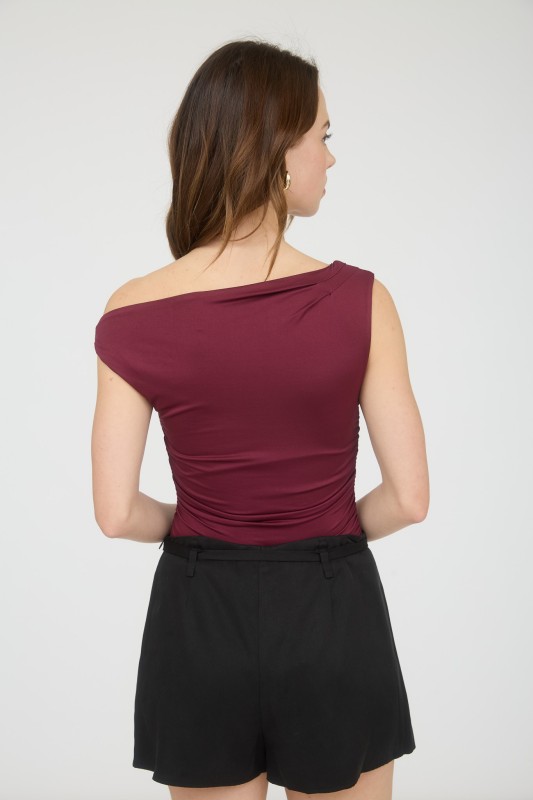 Asymmetrical off shoulder top with a twist sleeve. Side ruching and fitted. All sales final.
