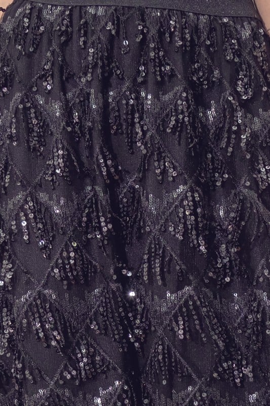 Adorable frilly sequin in a diamond pattern on mesh fabric. Elastic waistband, midi length and lined. ALL SALES FINAL.