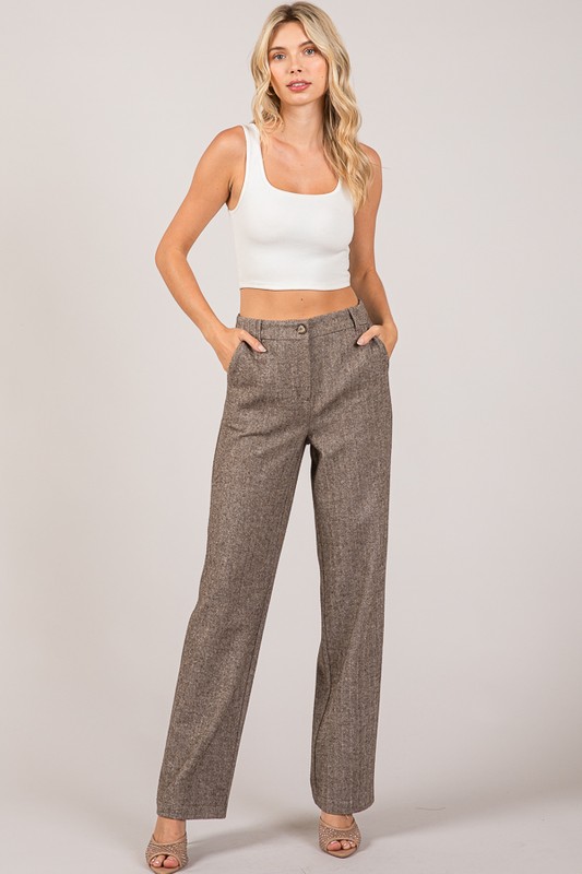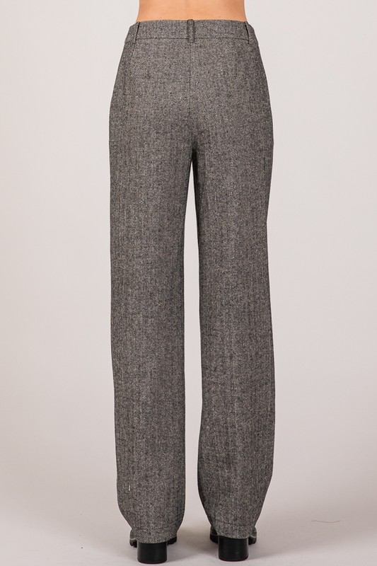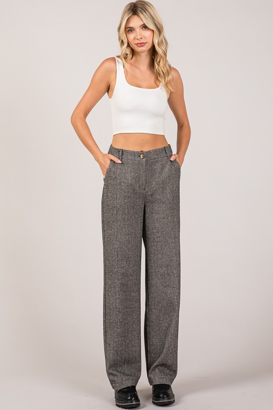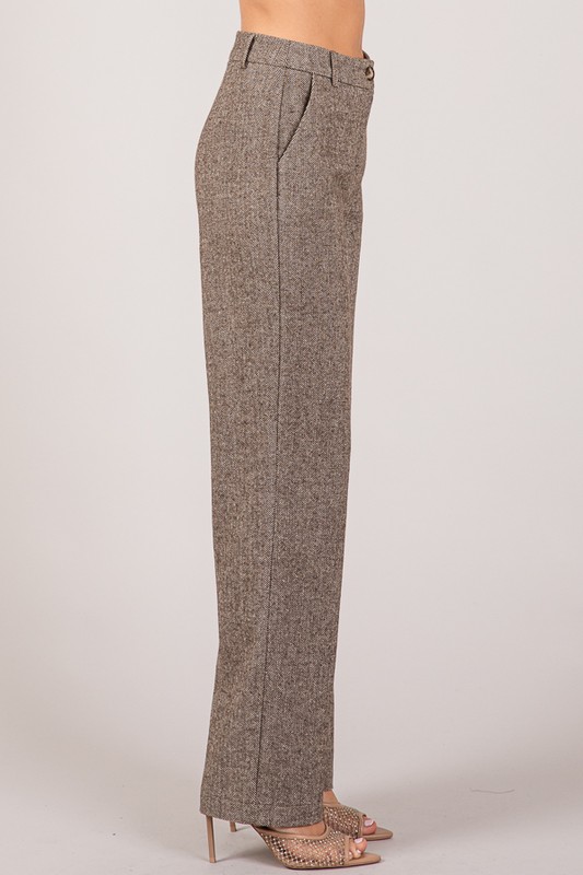Herringbone wide leg trousers with some stretch. Double button closure and usable side pockets. True to size. All sales final.