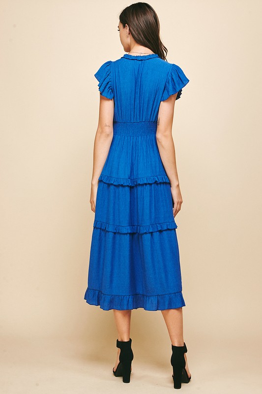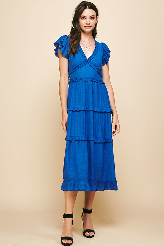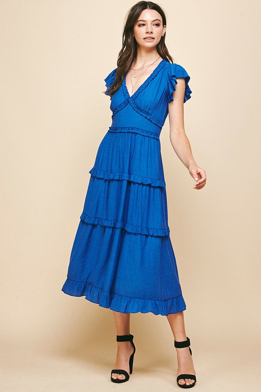 Royal blue dress with smocked waist and V neck . Flutter sleeves and ruffle tiered hem. True to size. All sales final.