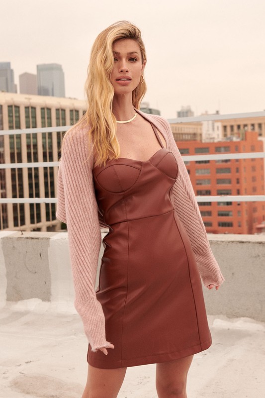 Fun faux leather mini dress with sweetheart neckline and cinnamon color. Zipper closure and adjustable straps. Fitted. All sales final.