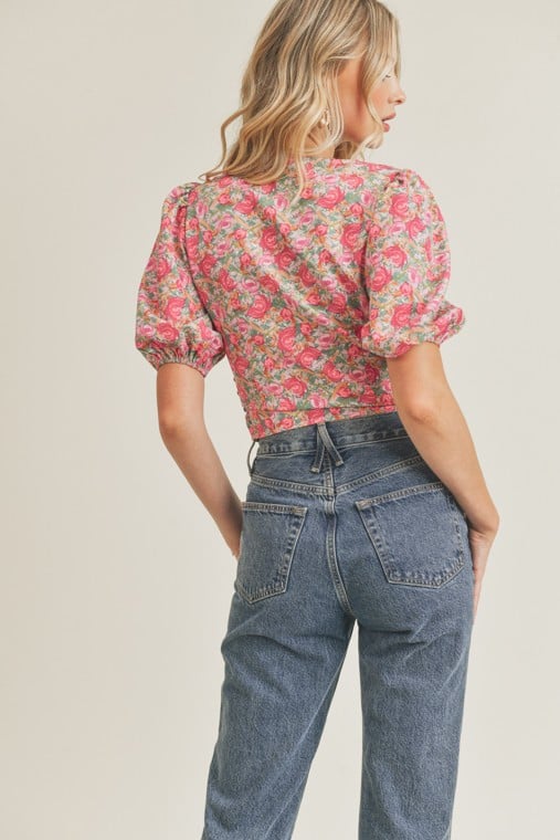 Bright floral print surplus blouse with front wrap and side button detail. Short puff sleeves and V neck. This top looks so great with high waisted pants. All sales final.