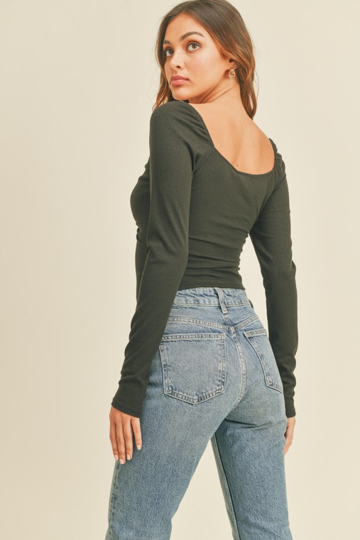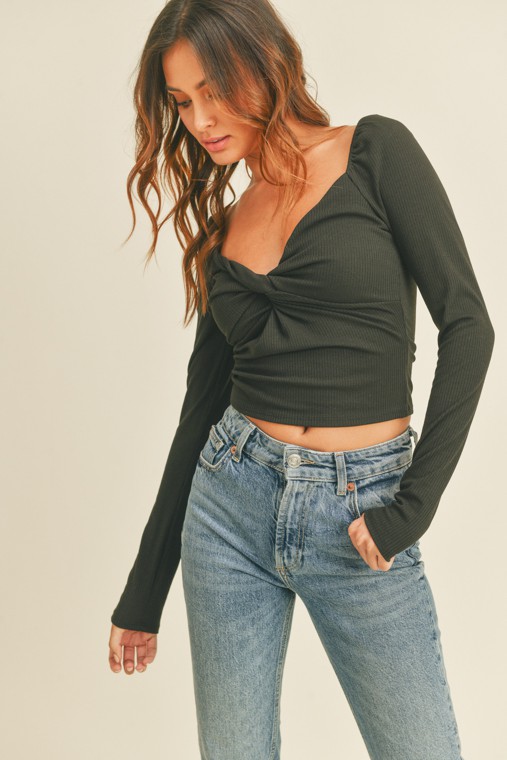 Twist front rib knit top with long sleeves. V neckline and cropped length. Fitted. All sales final.