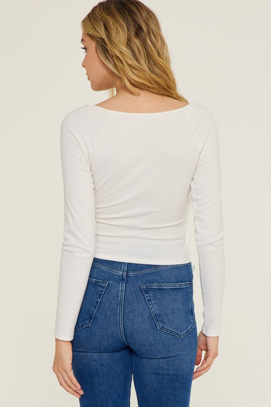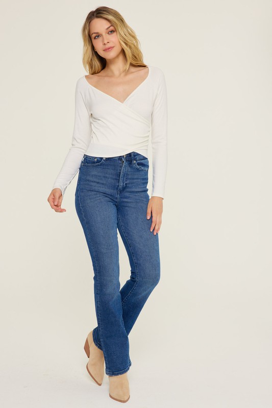 Soft, long sleeved wrap top. V neckline and cropped length. Fitted. All sales final.