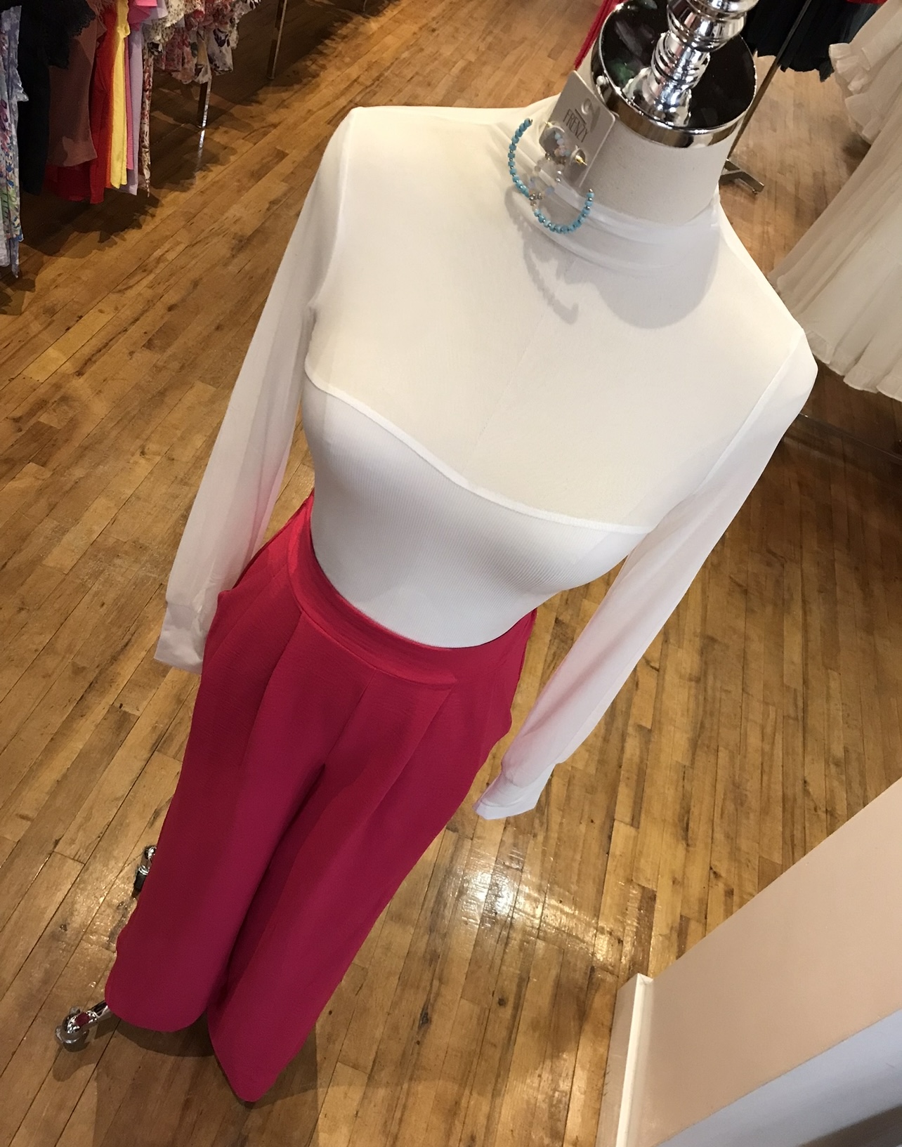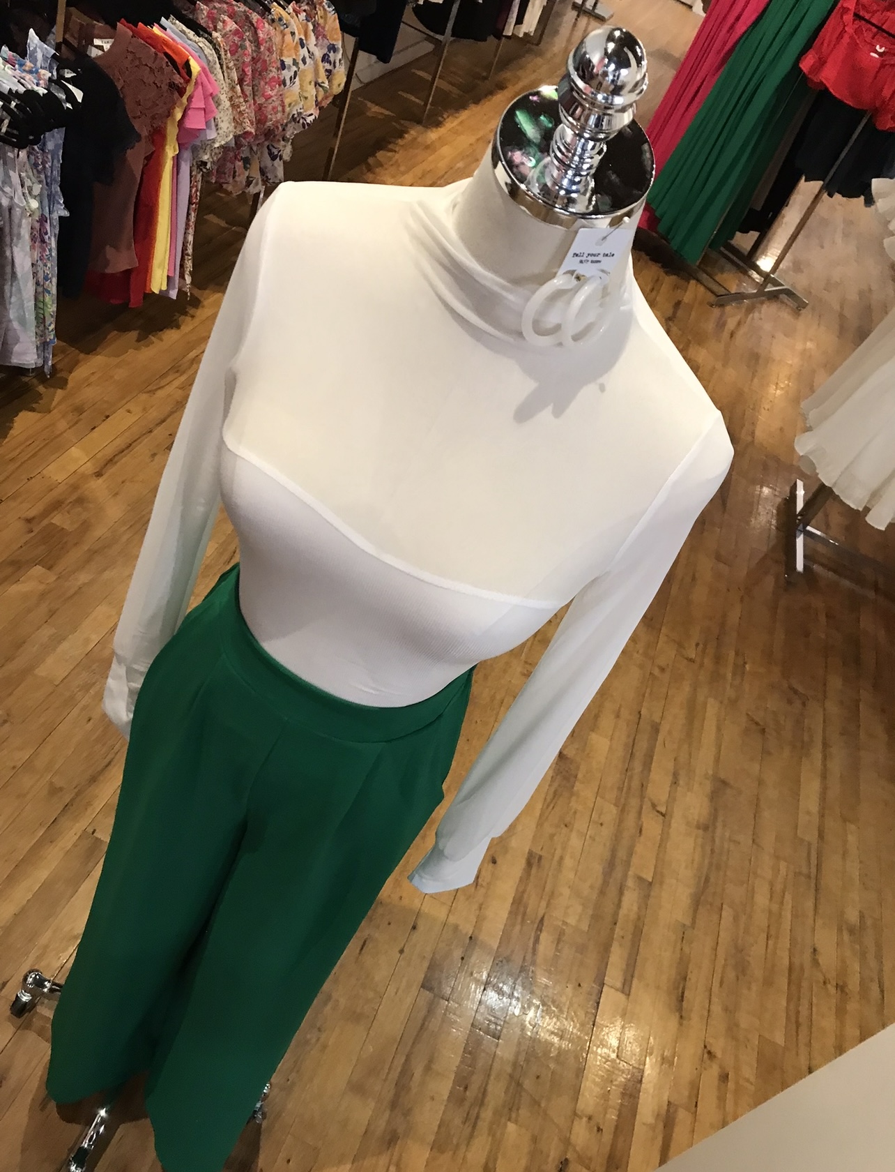 Sheer mesh top with high neck and long sleeves. Sweetheart neckline where fabric meets the mesh. Fabric portion is ribbed. Fitted. All sales final.