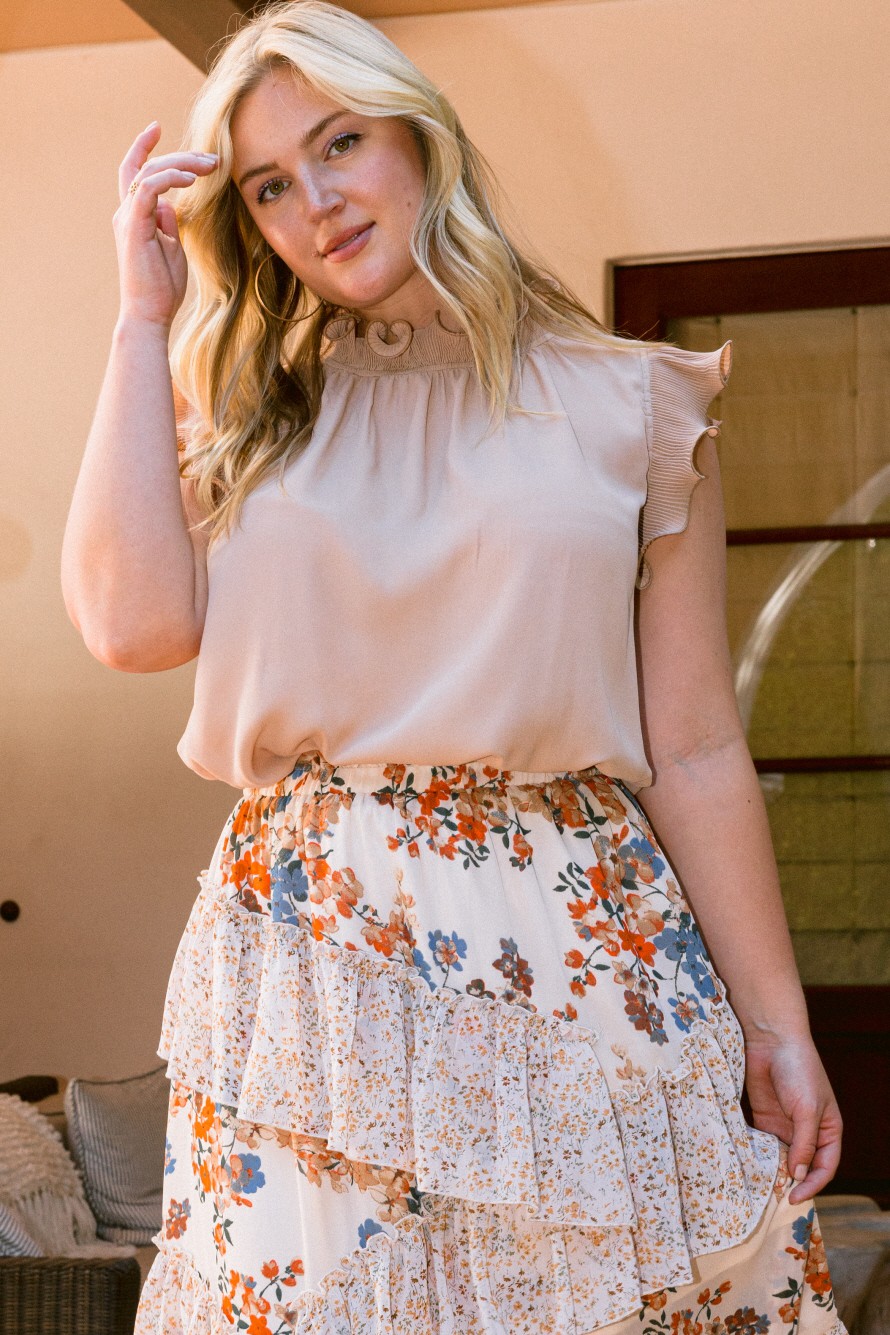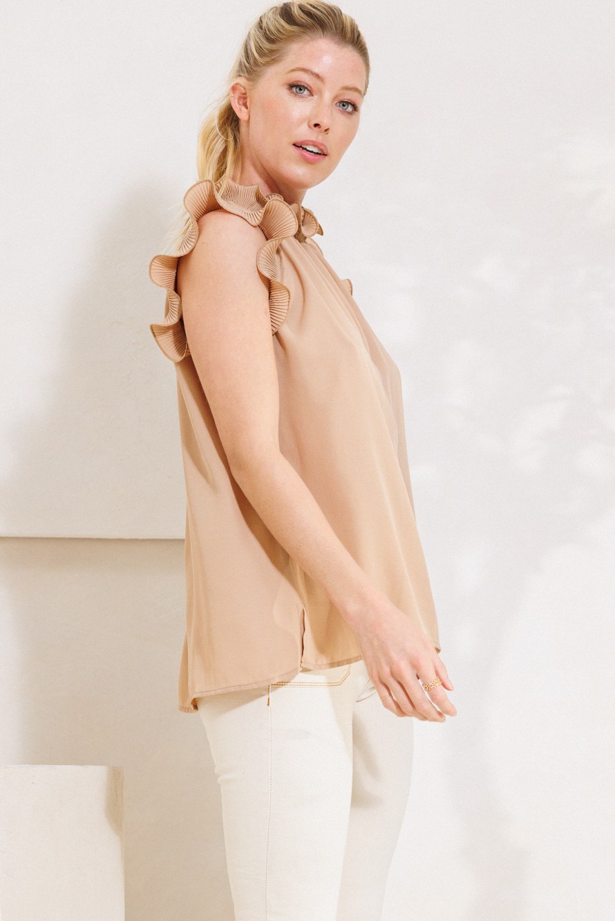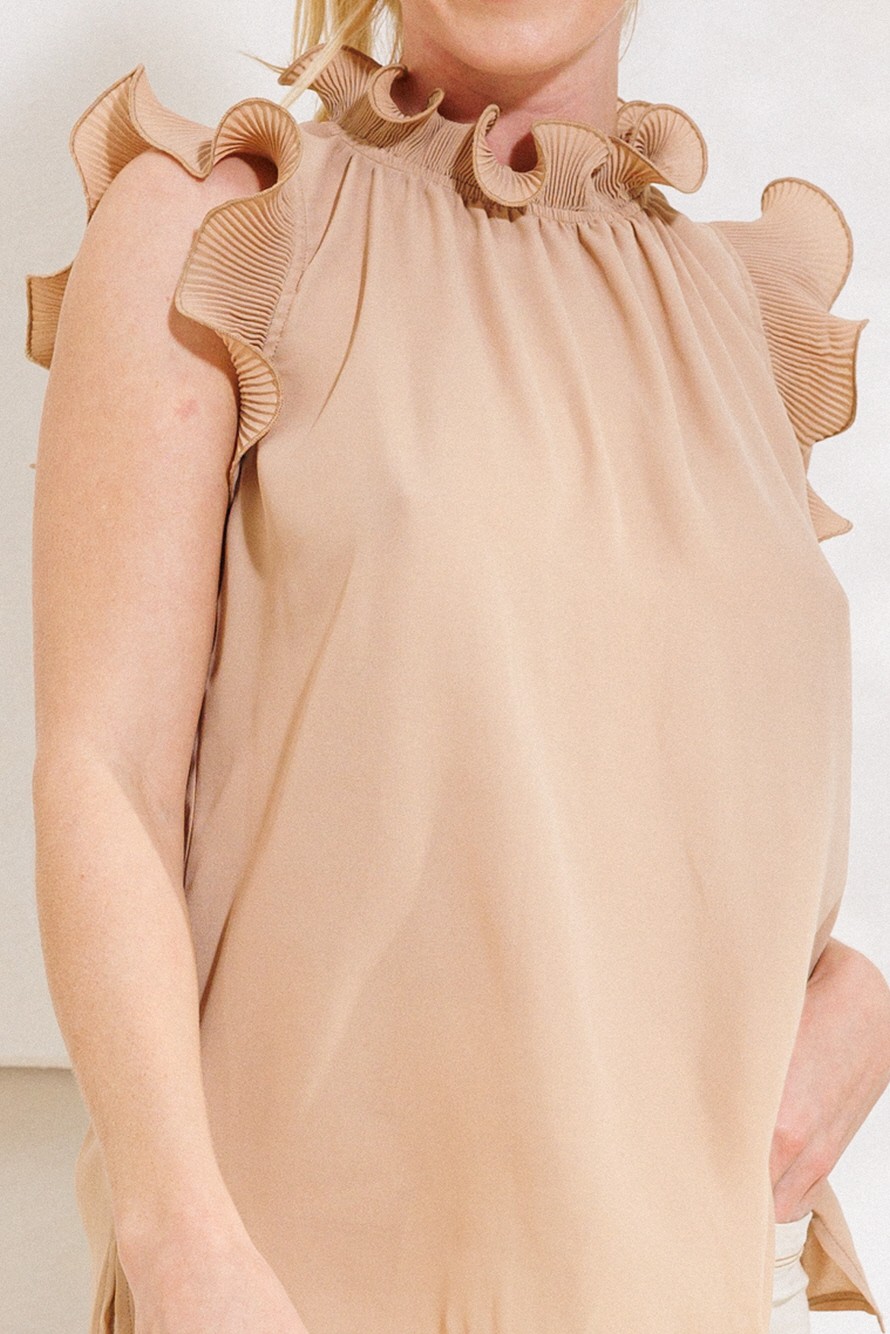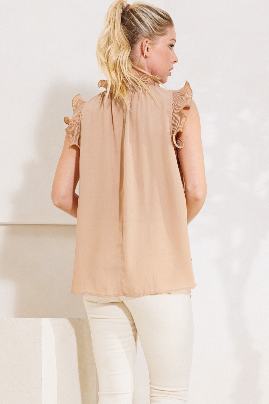 Adorable pleated ruffled detail on the neck and sleeve of this solid top. 100% polyester fabric. Flowy fit. All sales final.