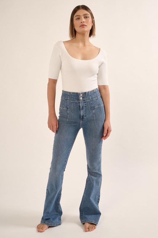 A solid, ribbed knit bodysuit with a scoop neckline, short sleeves, and fitted silhouette. Shaper Fit styles feature premium stretch fabric and contour fit designed to sculpt the body. All sales final.