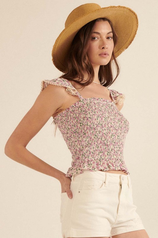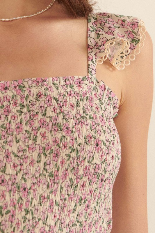 A floral print, woven cami top with a straight neckline and smocked bodice.