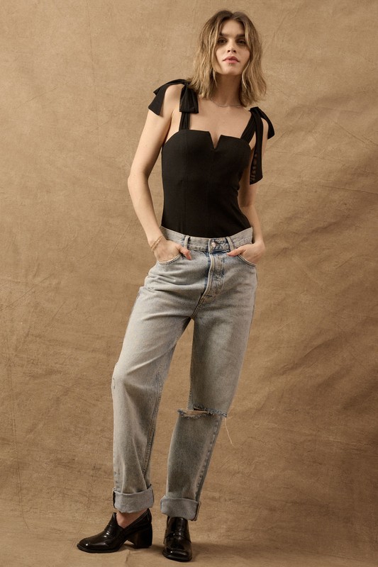 A knit bodysuit with V-wire neckline and self tie straps for the perfect fit. Low back and bottom with snap crotch. Fitted silhouette. All sales final.