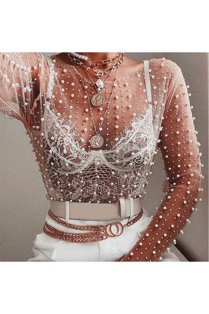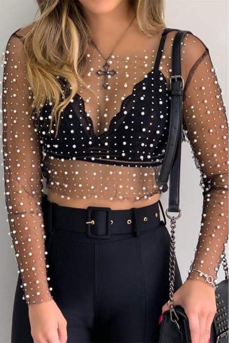 Sheer scoop neck top with pearl detail! Perfect paired with a cami or worn over a strappy dress. True to size. All Sales Final.