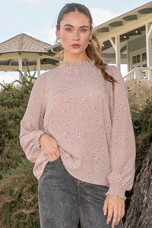 Dainty floral print and long sleeves on this taupe blouse. High ruffle neck with button closure. Flowy fit. All sales final.