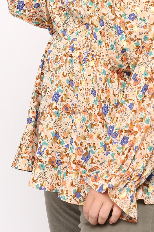 Floral print with beautiful gold foil throughout. Smocked waist and long sleeves. True to size. All sales final.