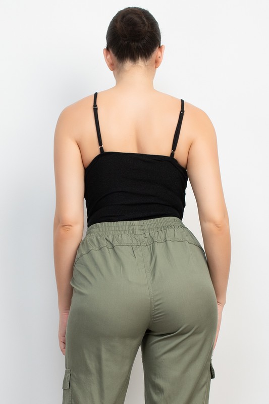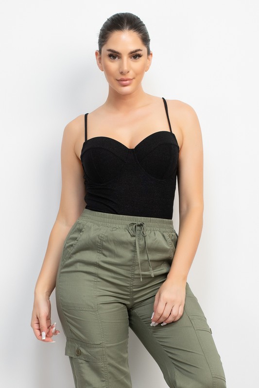 This black glitter cami is the perfect piece with high waist pants and a jacket. Sweetheart neckline and adjustable straps. Soft stretchy fabric. Fitted. All sales final.
