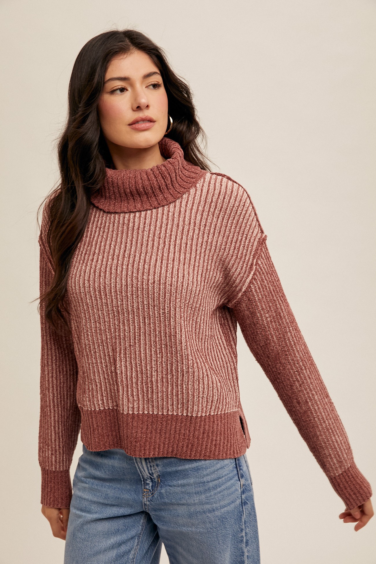Soft chenille two-tone turtle neck sweater. Slightly oversized fit. All Sales Final.