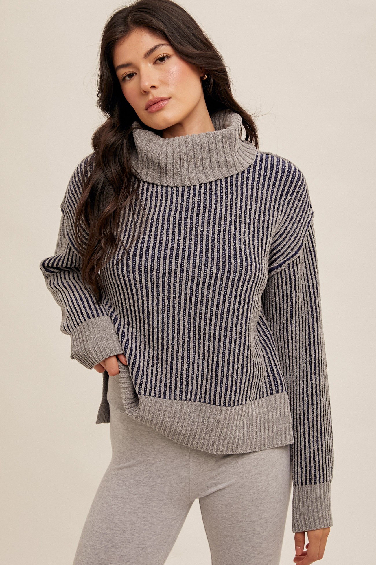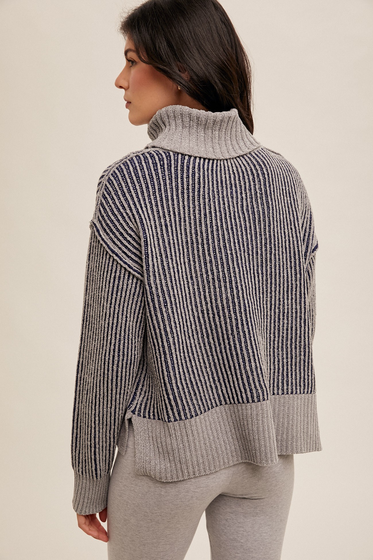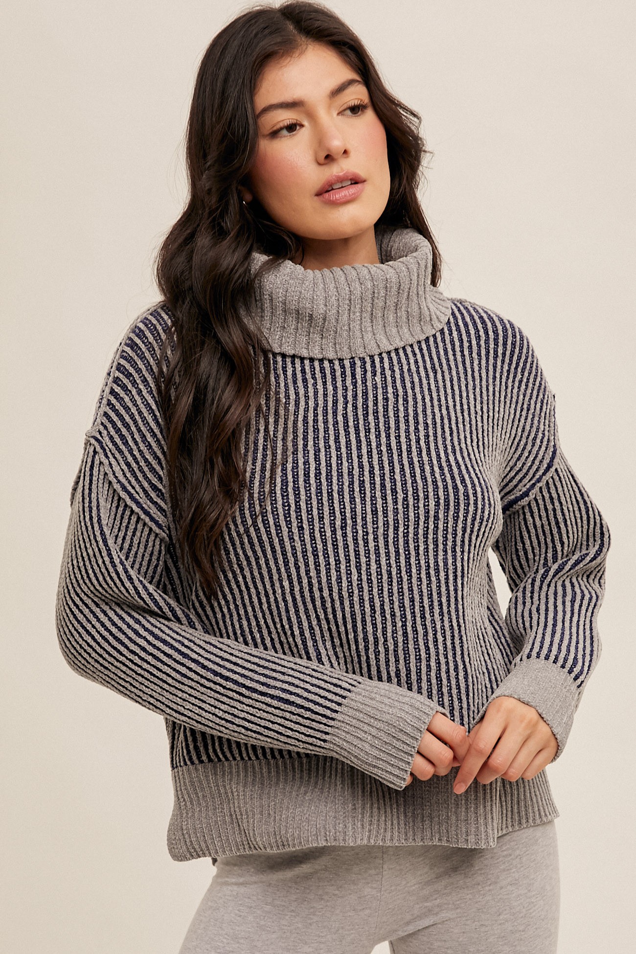 Soft chenille two-tone turtle neck sweater. Slightly oversized fit. All Sales Final.