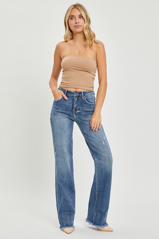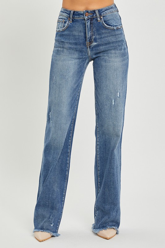 Super soft and stretchy fabric with a dark wash. High rise, straight leg with slight distressing and frayed hem. Rise 10" Inseam 34" ALL SALES FINAL.