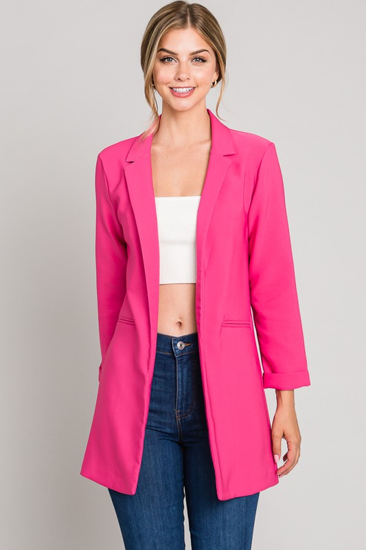 This is our best selling blazer! Luxury Twill Fabric with great stretch. Buttonless, open blazer with rolled cuff. Notched collar and great longer length. All Sales Final.