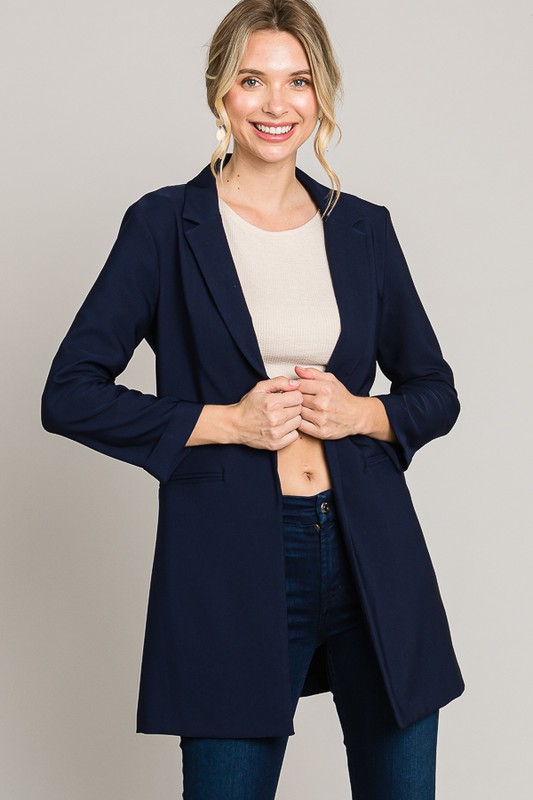 This is our best selling blazer in navy blue! Twill fabric with great stretch. Buttonless, open blazer with rolled cuff. Notched collar and great longer length. All Sales Final.