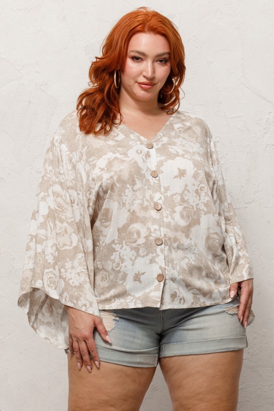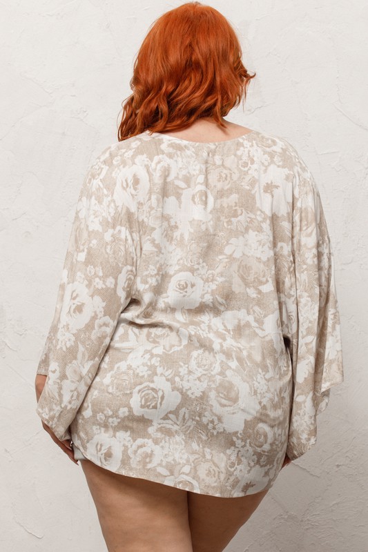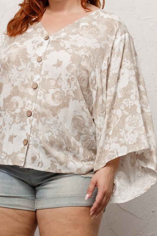 Taupe color with a delicate floral print. V neck, button down with adorable kimono sleeves. True to size. All sales final.