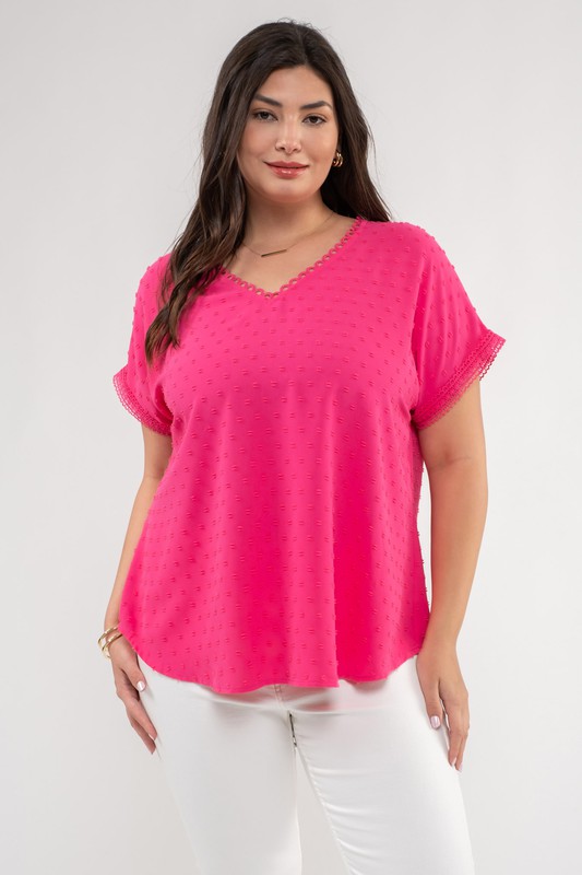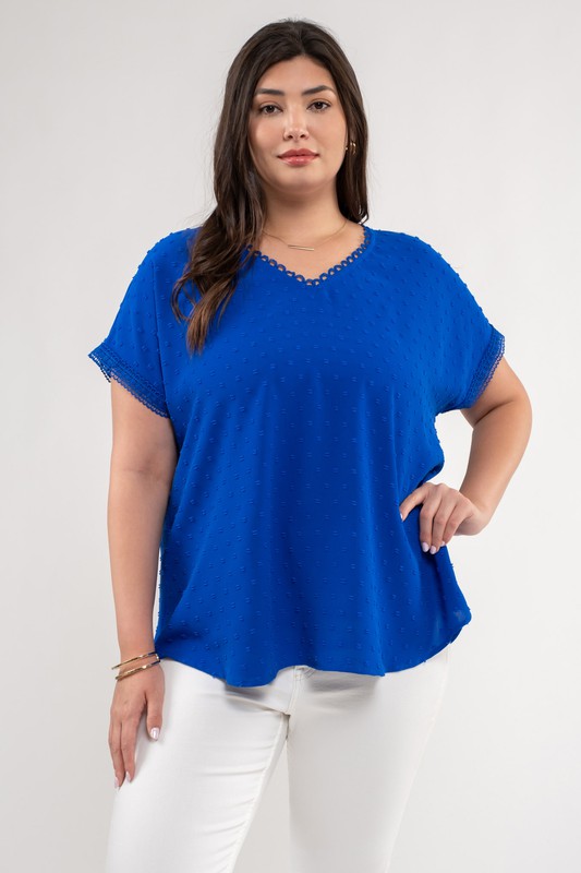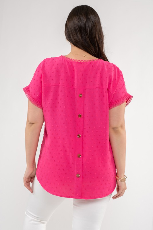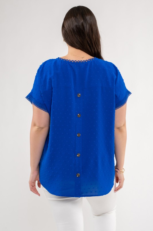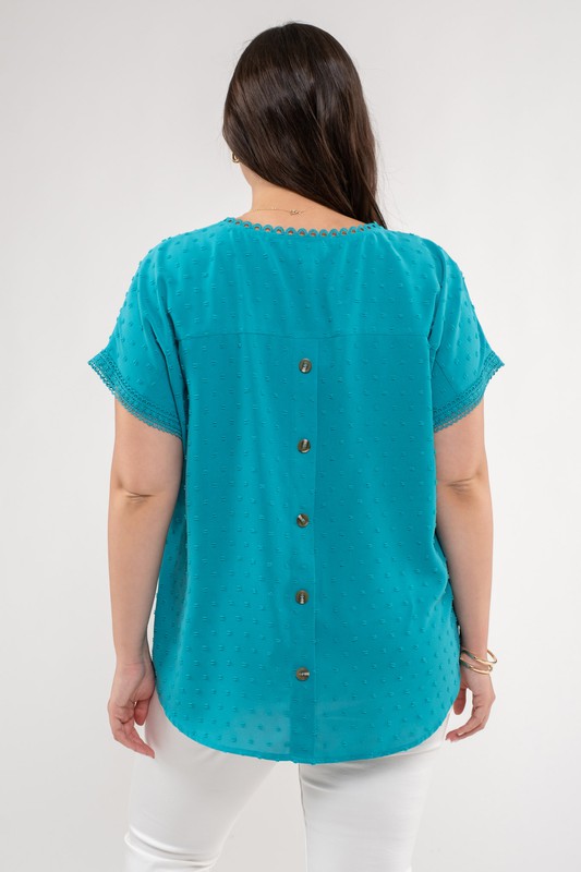Flowy top with swiss dot and lace trim detail. Buttons down the back. All sales final.