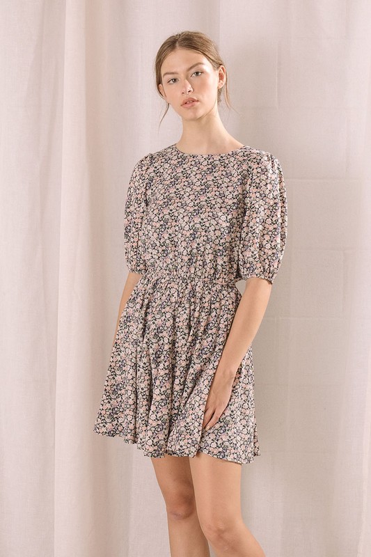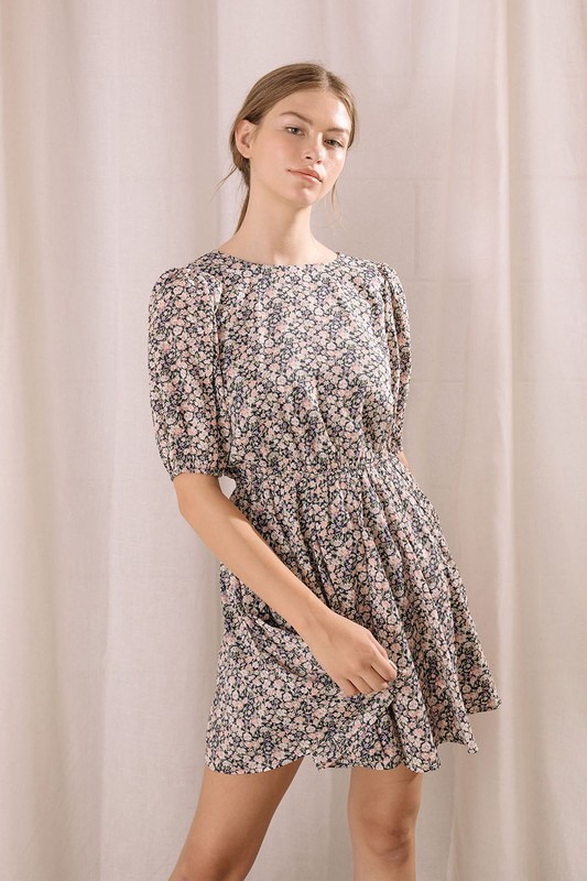 Floral print A line mini dress with open back and tie closure. Short puff sleeves and elastic waist. True to size. All sales final.