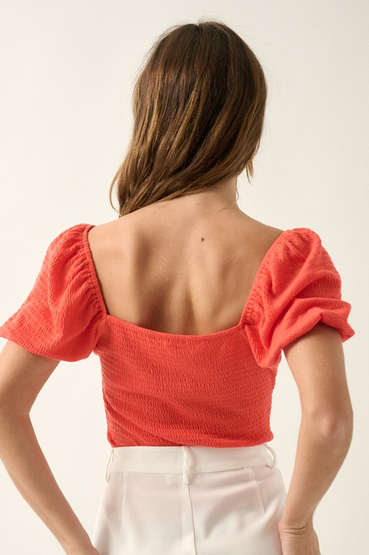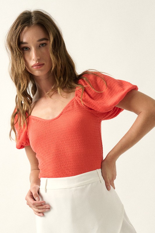 Smocked knit top with puff sleeves and sweetheart neckline. This top looks so great with high waisted skirts and pants. All sales final.