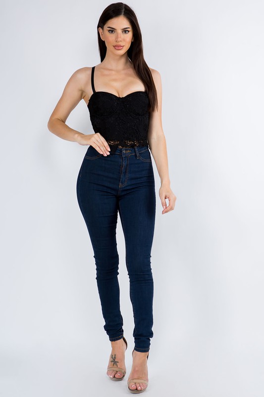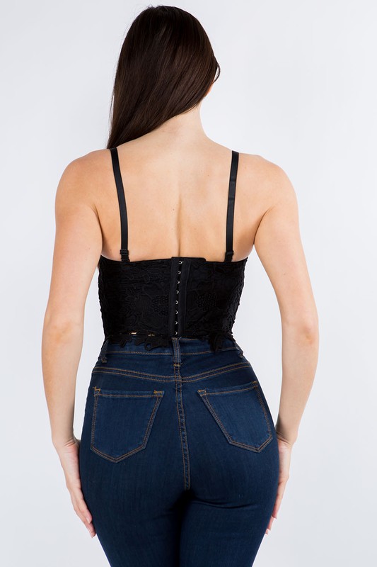 Crochet lace corset with eyelet closure up the back. Adjustable and removable straps. Fitted silhouette. All sales final.