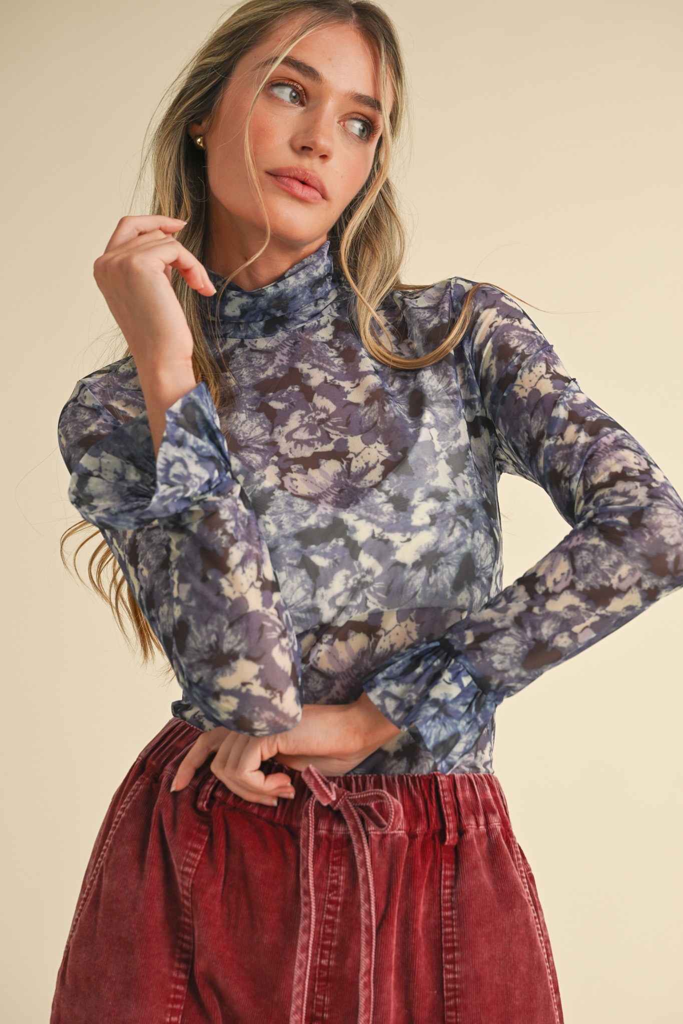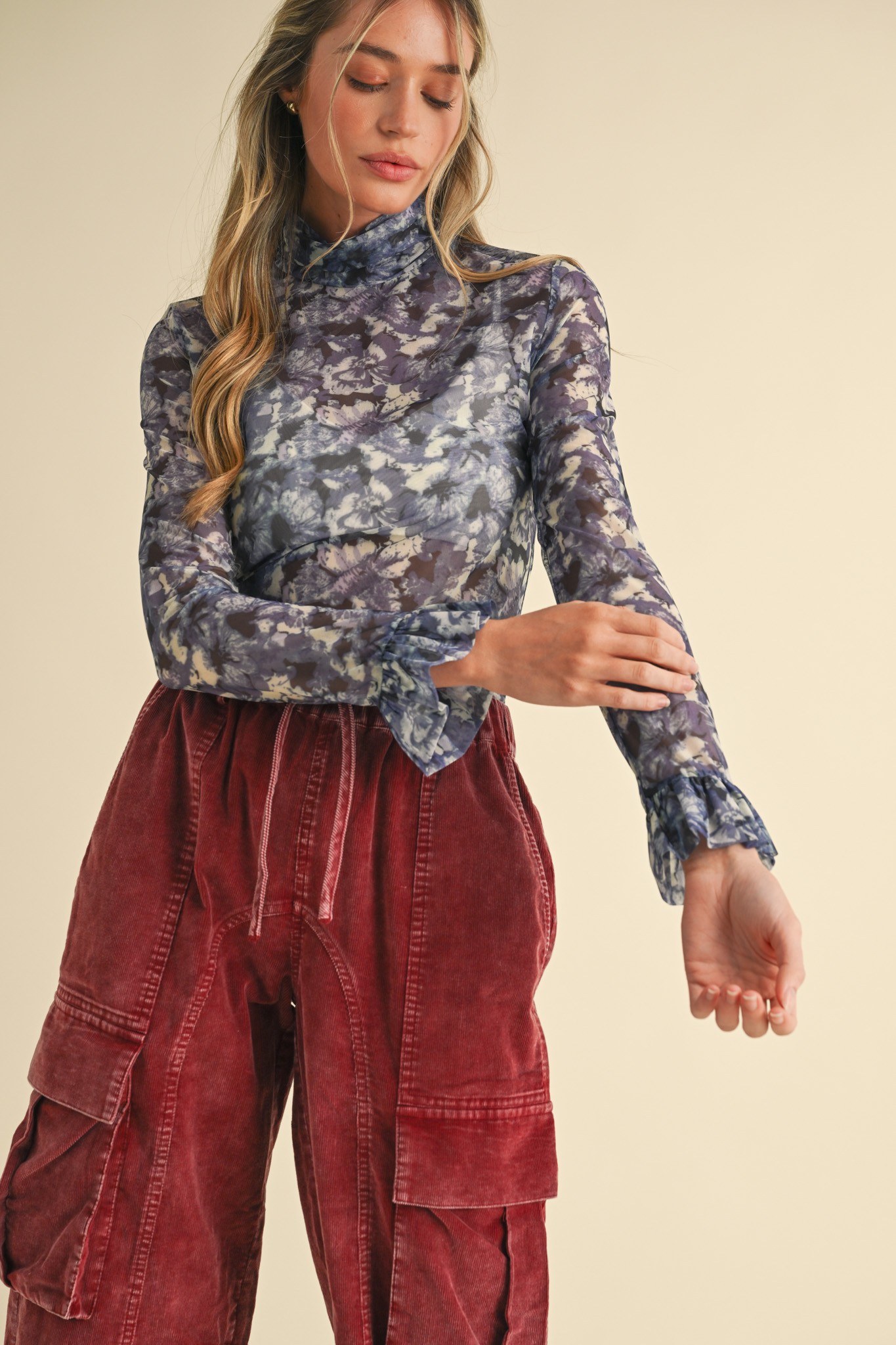 Beautiful floral print on this mesh long sleeve top. Great piece to tuck with high waisted denim. Ruffled bell sleeve detail. Slightly fitted. All sales final.