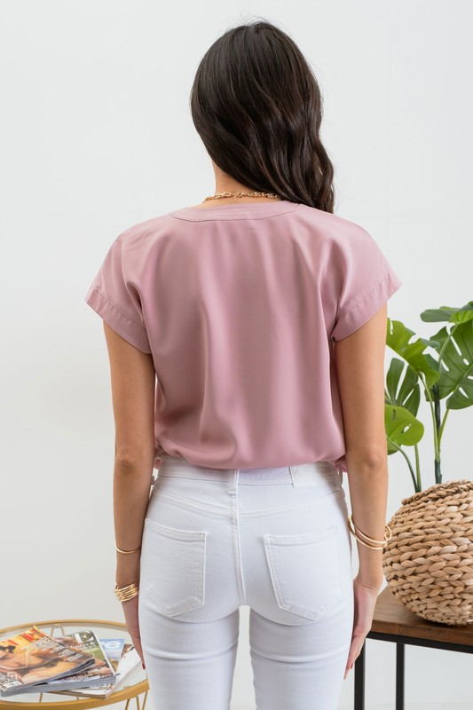 Short sleeve blouse with V neck and stitching detail. Flowy fit. All sales final.