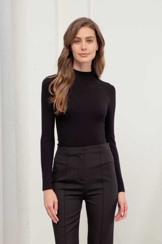 This taupe mock neck sweater is perfect paired with a skirt or denim. Fitted. All Sales Final.