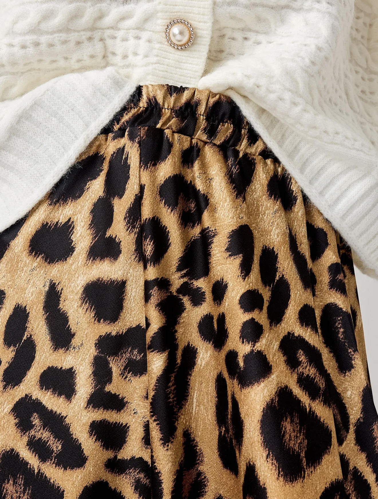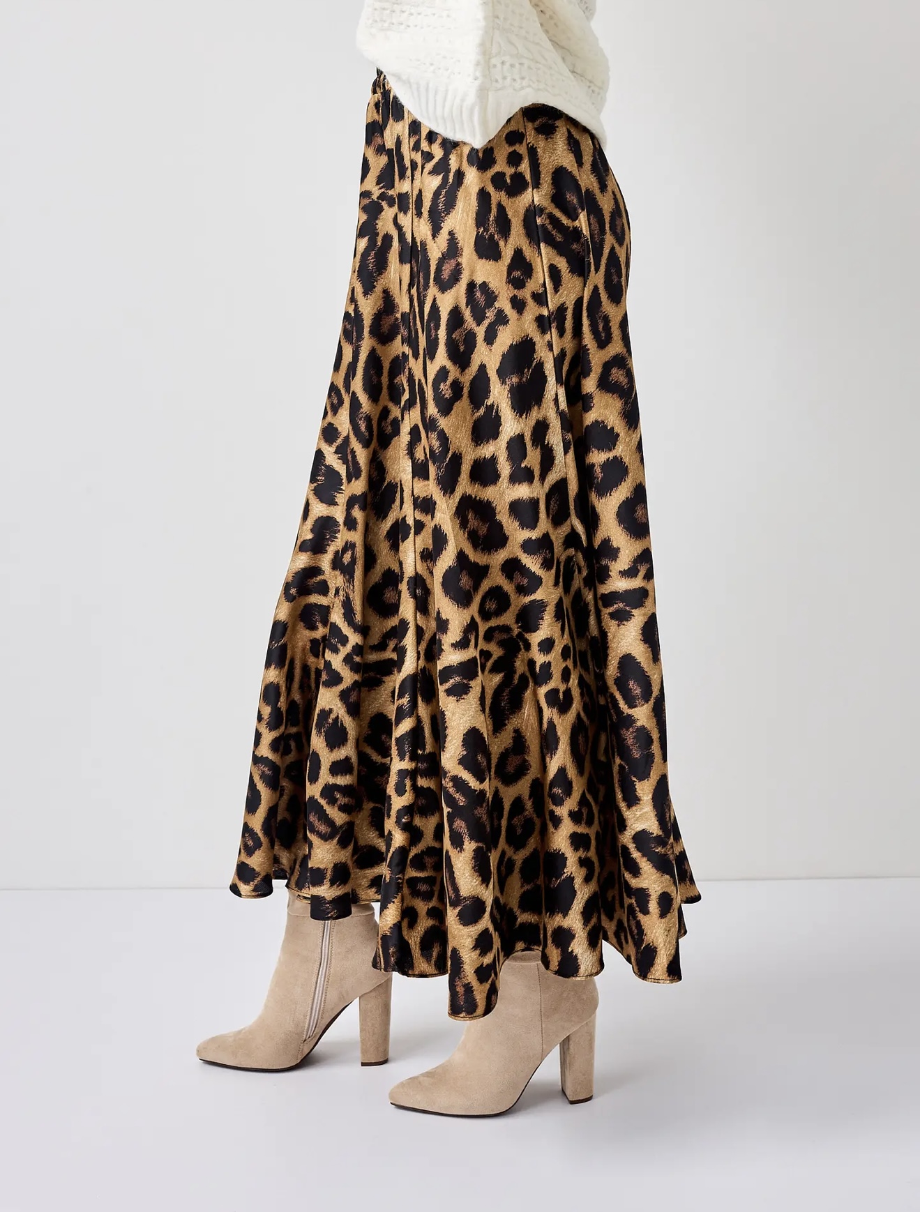 Flattering a-line skirt with leopard print. Satin fabric with elastic waist. ALL SALES FINAL.