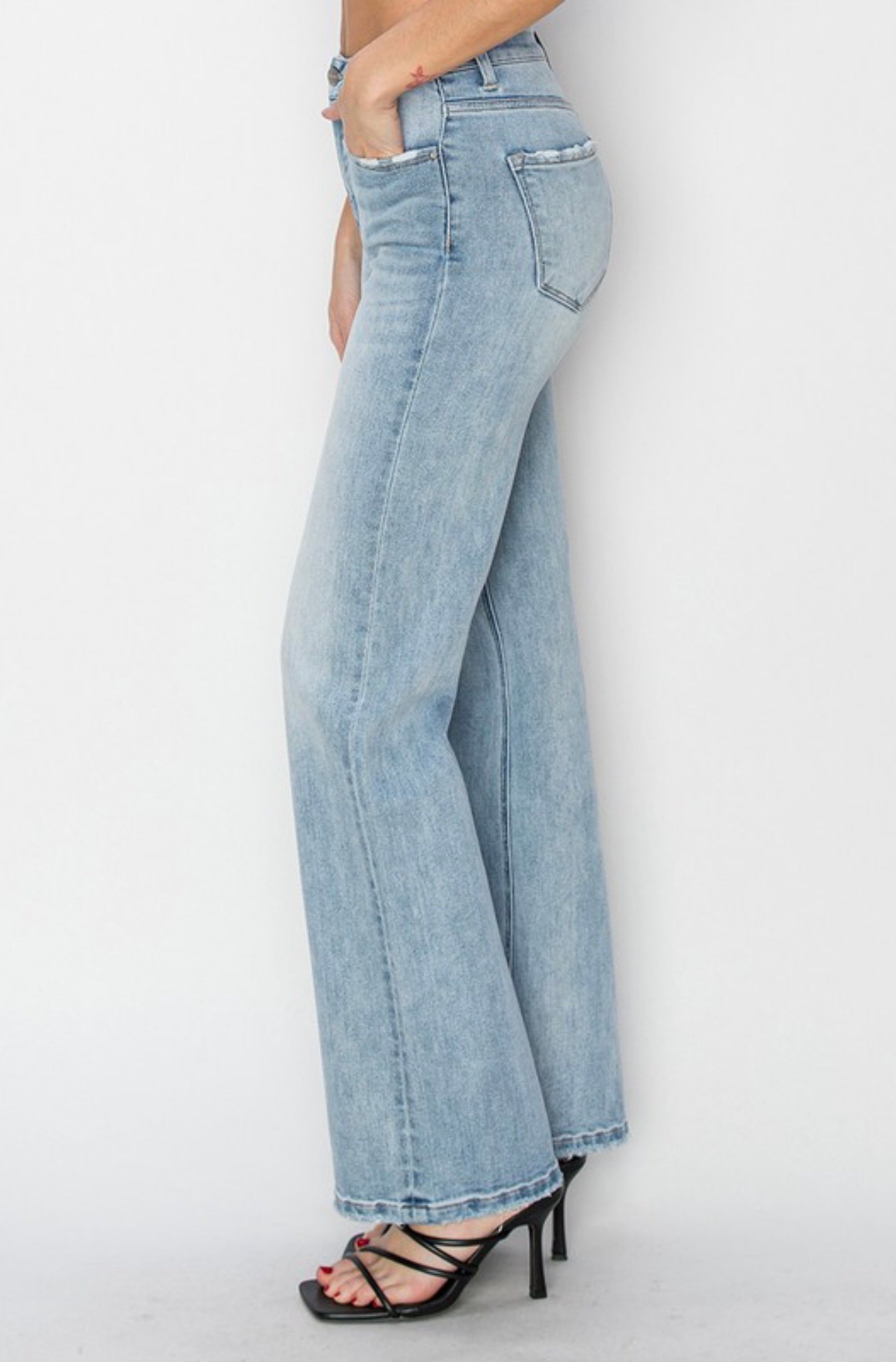 Super soft and stretchy fabric with a light wash. High rise, straight leg with slight distressing and frayed hem. 12 inch rise. 33 inch inseam. ALL SALES FINAL.