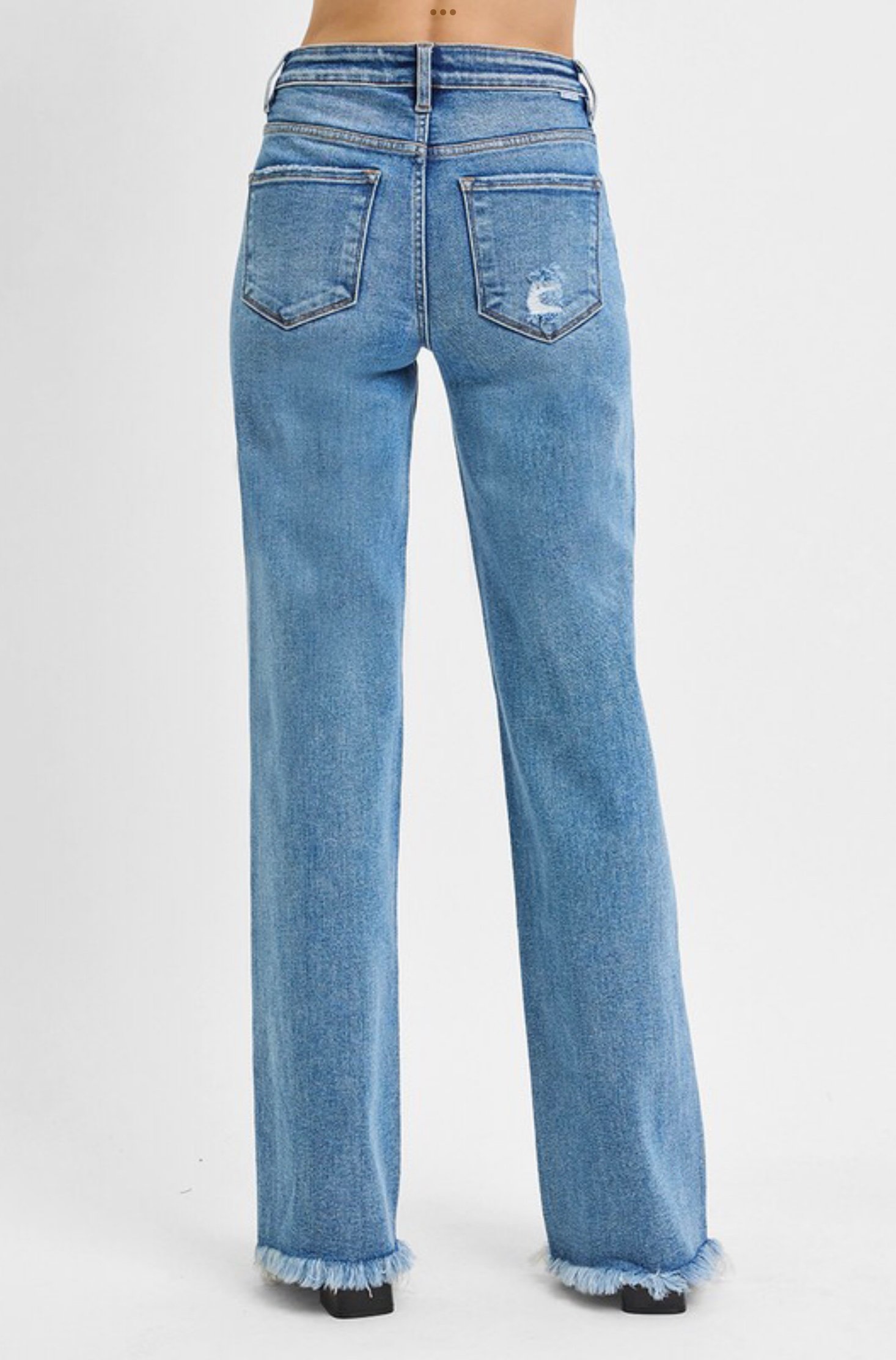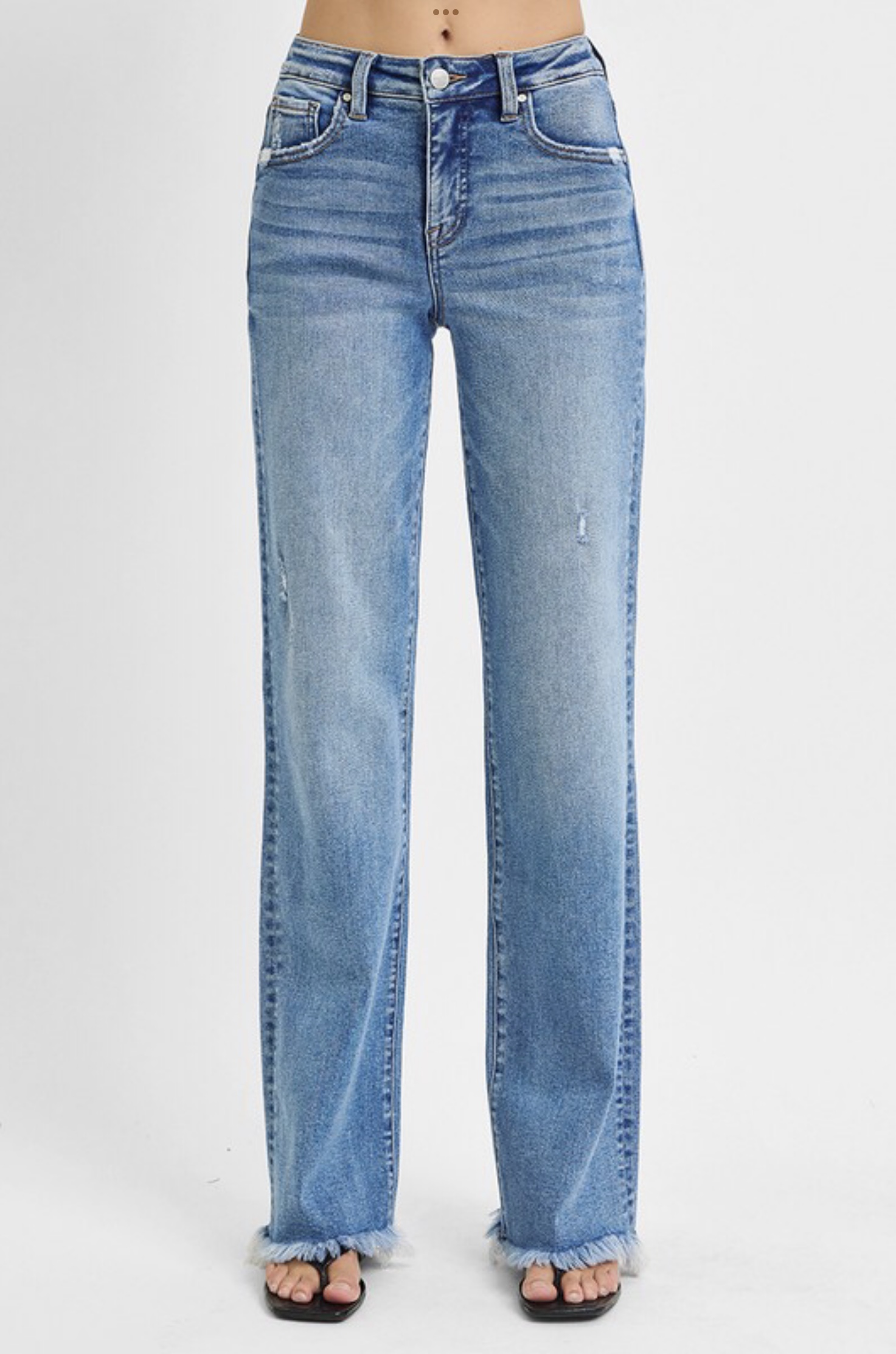 Tummy control, soft and stretchy with a medium wash. High rise, straight leg with slight distressing and frayed hem. Rise 10" Inseam 34" ALL SALES FINAL.