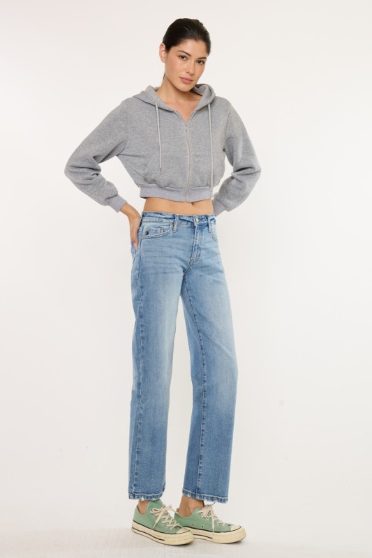 High rise with soft and stretchy fabric in medium wash. Slim wide leg with minimal distressing. 10” rise. 28” inseam. ALL SALES FINAL.