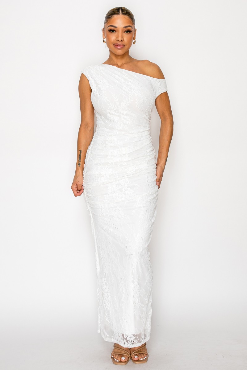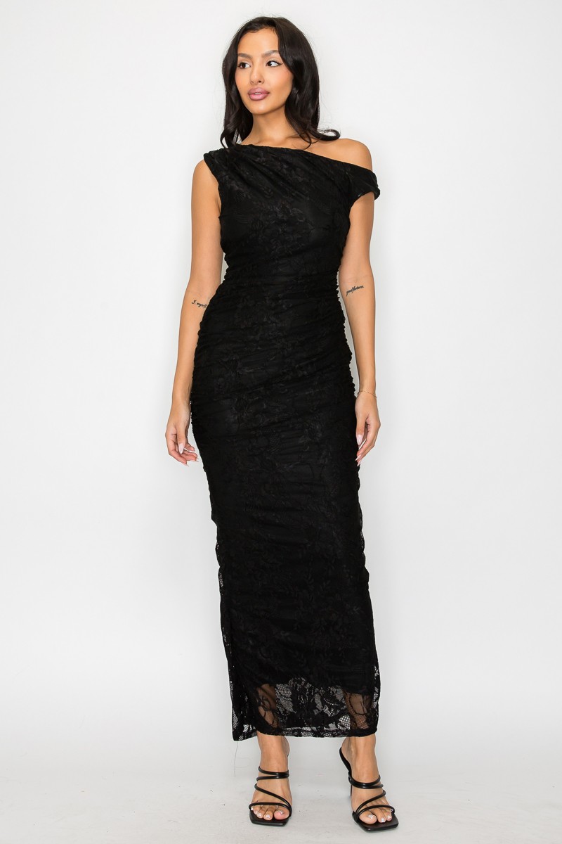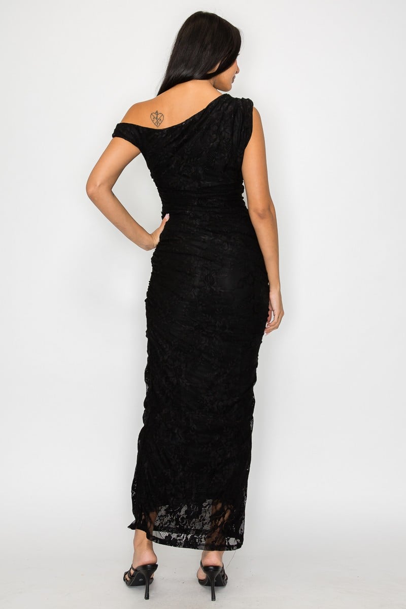 Beautiful off shoulder lace bodycon dress Nice stretch with lining. Midi length and side ruching. Fitted. All sales final.